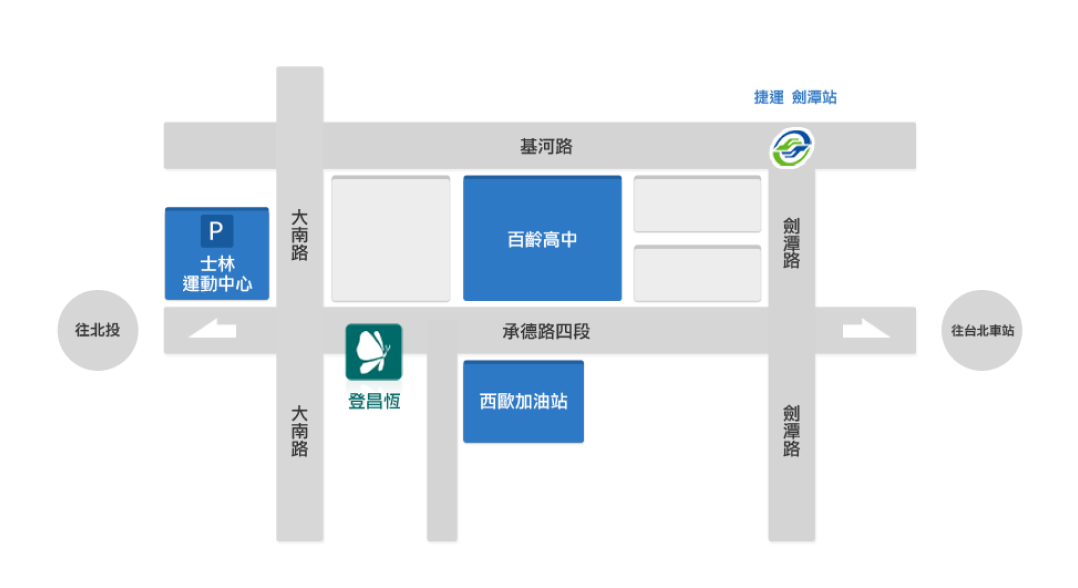 請於劍潭站下車,由 1 號出口(往士林夜市)出站。