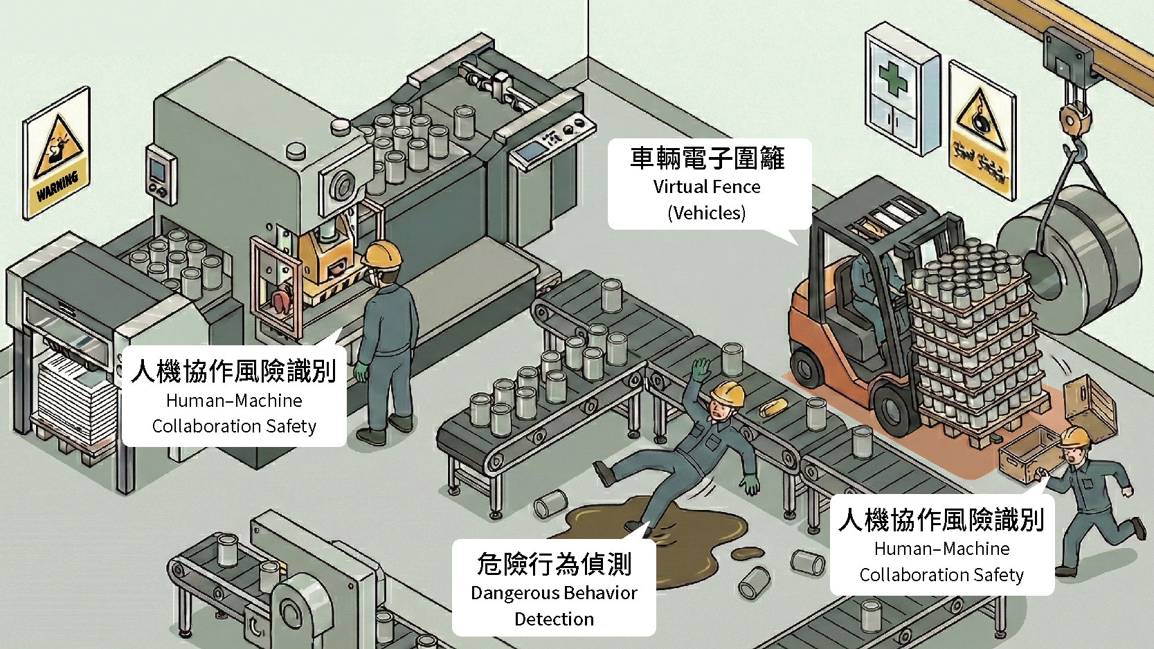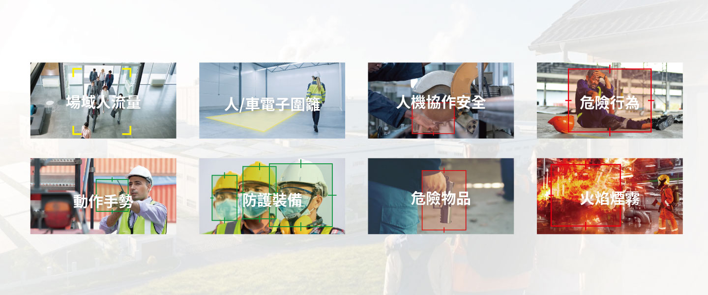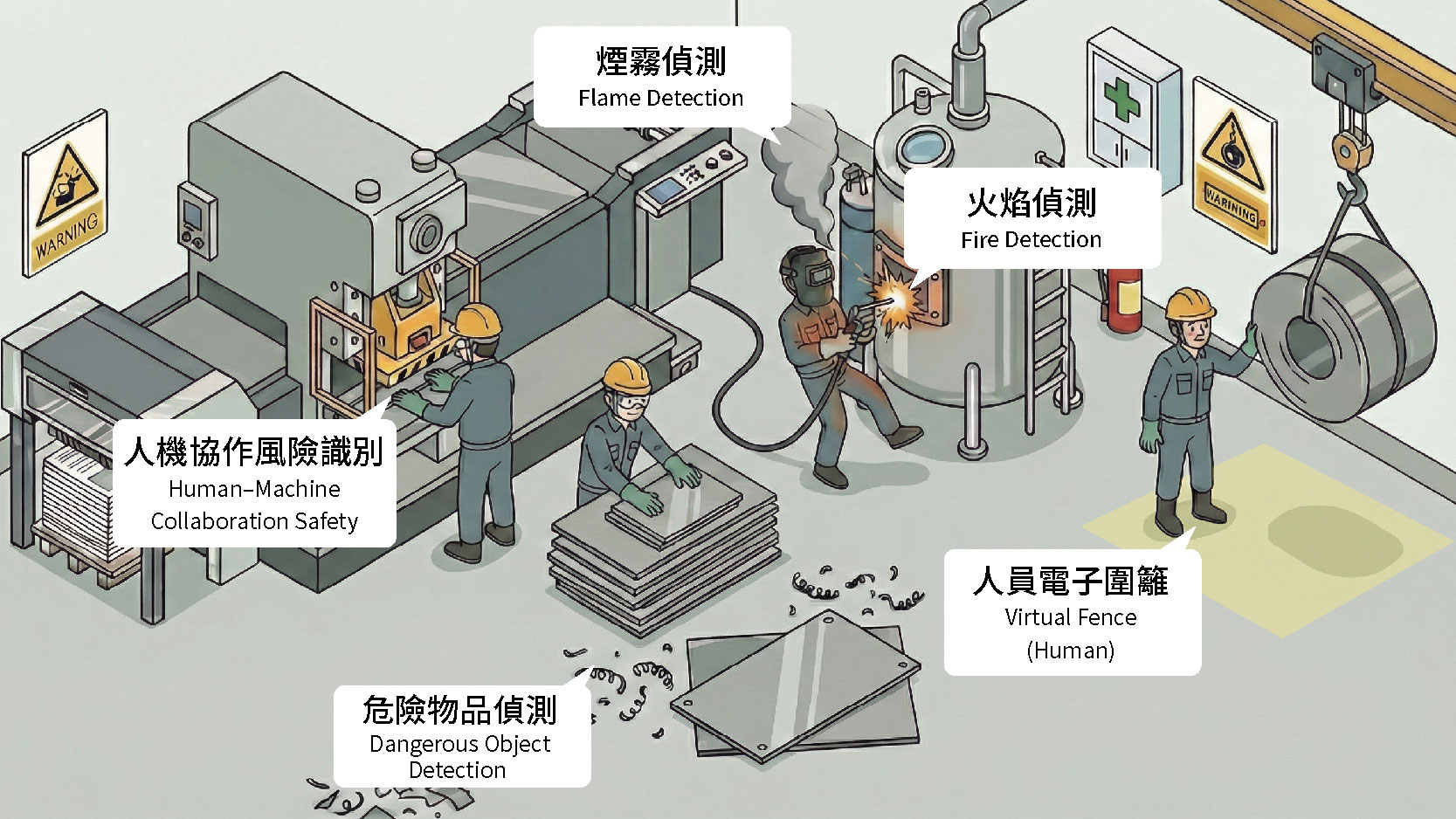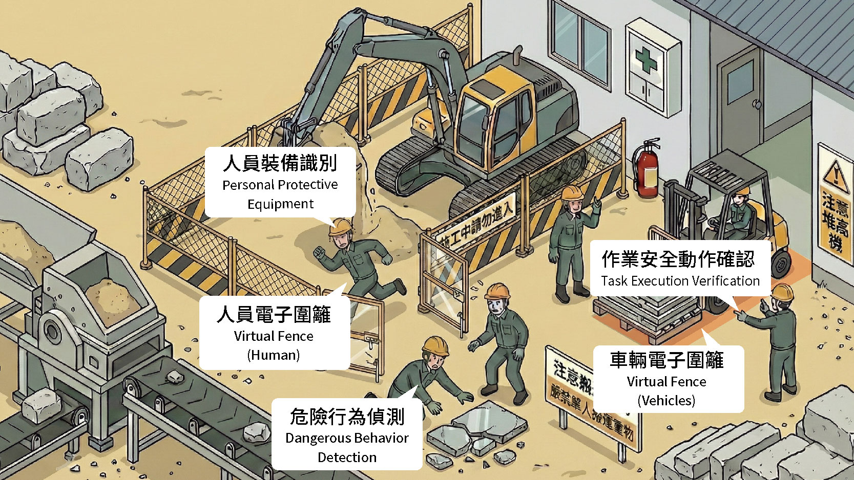 AIEHS 提供全方位的工安監測方案:不僅能精準統計場域人流、控管人車誤入,更可深度分析人機協作風險。系統具備高度辨識能力,能自動偵測工人行為、手勢及裝備配戴(PPE),確保操作符合標準規範。此外,針對環境異常,系統亦能即時判別煙霧與火苗,預防災害於未然。