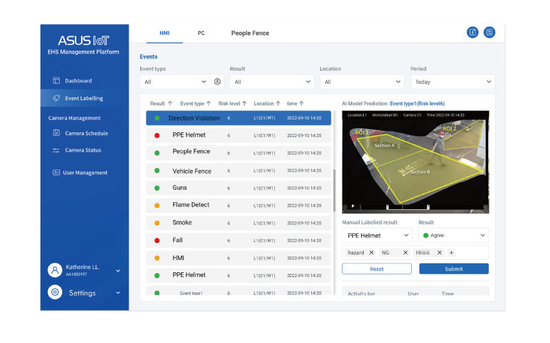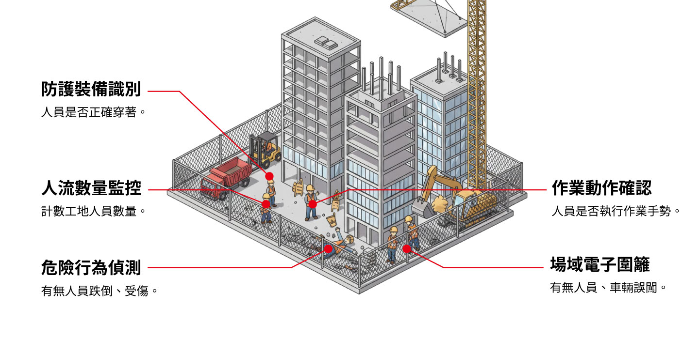 AIEHS 使用在大型建築工地中,可透過 AI 影像監控計算進出工區的人員數量,確認工地是否有人員、車輛誤入危險施工區域(如:挖土機作業區、高壓電、重型吊車範圍),且可偵測工人是否有正確完成作業手勢與口令,若有人員跌倒或疲勞行為,則立即通報警示。