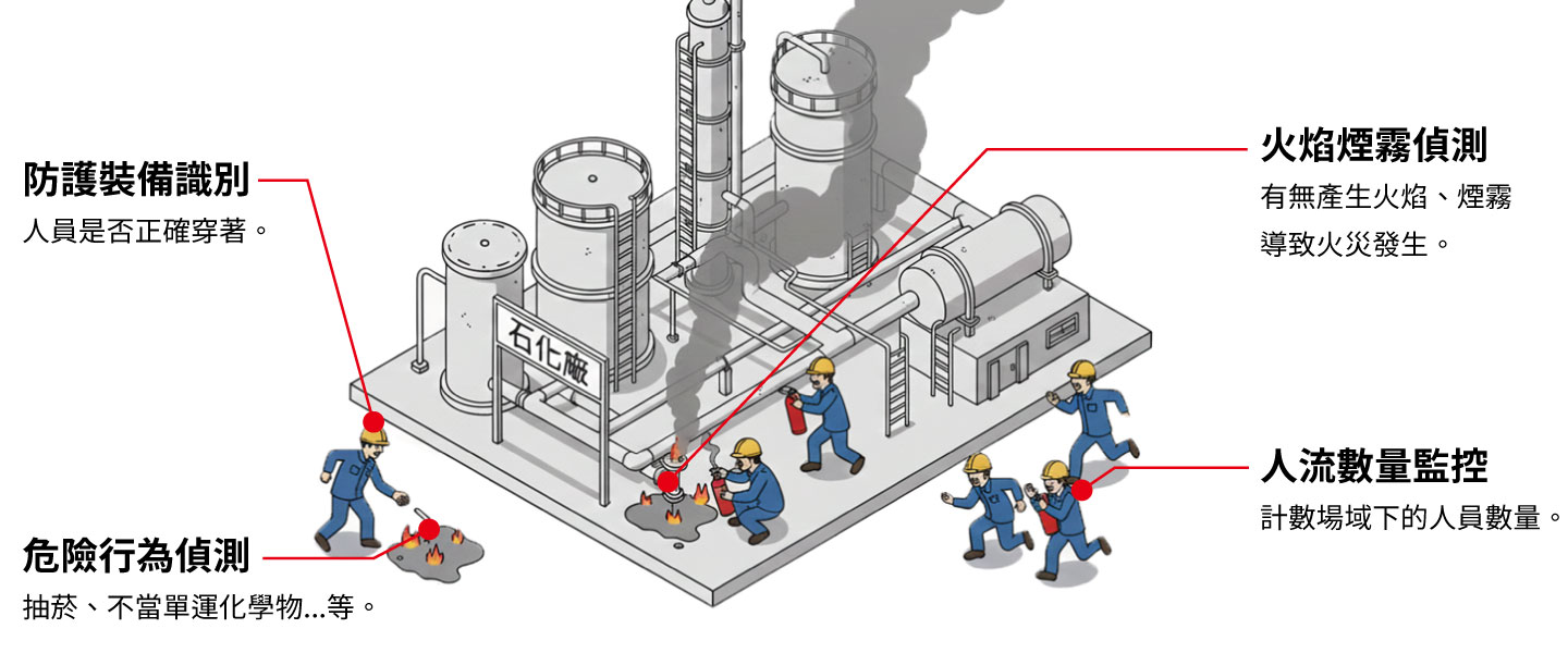 在石化廠或油庫, 除了可作防護裝備識別及人流數量監控外,AIEHS 更能辨識人員是否有作出不當危險行為,如抽菸、不當搬運化學物...等,並持續偵測有無火焰及煙霧,避免火災的發生,