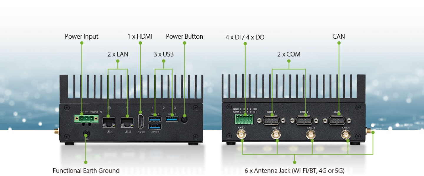 | DIO | 4 x DI, 4 x DO (2x5 Terminal Block, w/ isolation) | ||||
