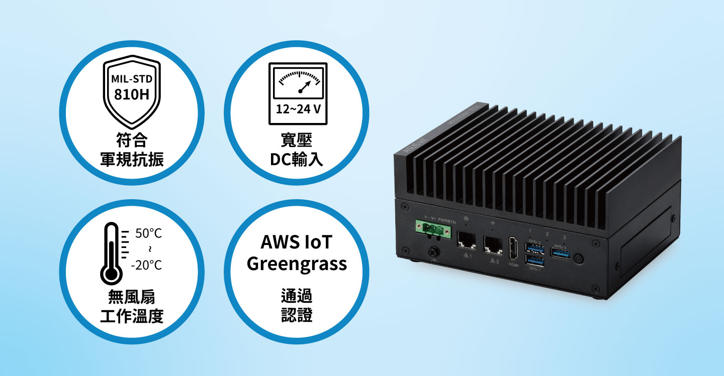 PE1100N通過AWS IoT Greengrass認證,符合MIL-STD-810H軍規抗震,採用寬壓、寬溫使主機於各式場域下,展現高效表現。