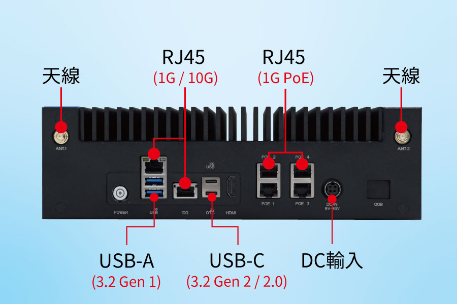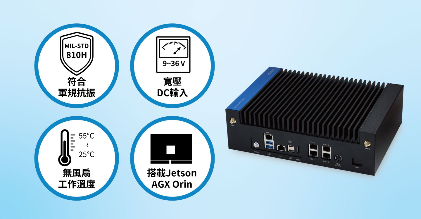 搭載 NVIDIA Jetson AGX Orin,功耗僅 40-60W,卻可提供高達 275 TOPS 的卓越 AI 推論效能,其堅固的高效能無風扇設計,卓越的散熱與電源設計,可在 -25°C 至 55°C 的環境以及 9 至 36V 寬廣的 DC 輸入電壓範圍內運作,機械設計符合 MIL-STD-810H 美國軍規測試標準,可承受各種衝擊和振動,適合智慧工廠、智慧運輸、資訊站...等嚴苛應用情境。