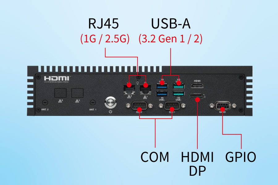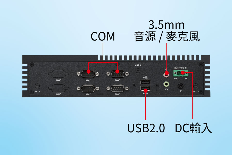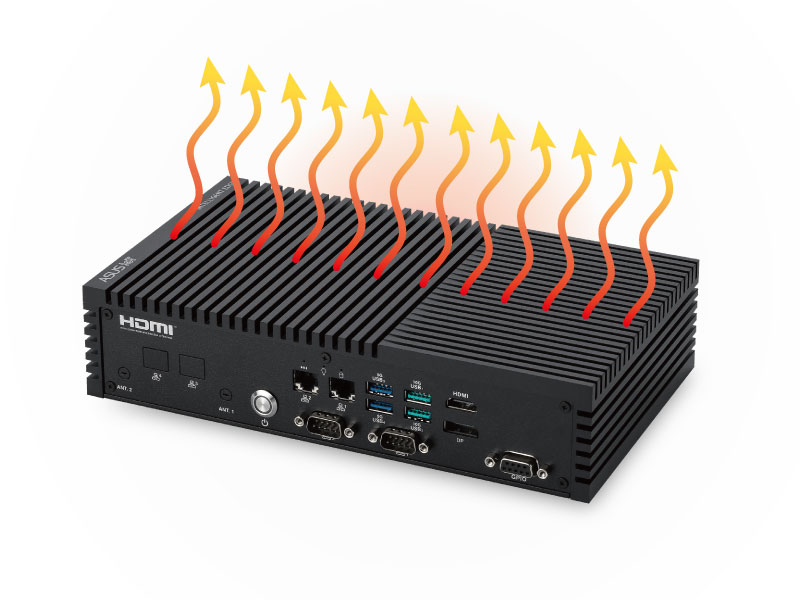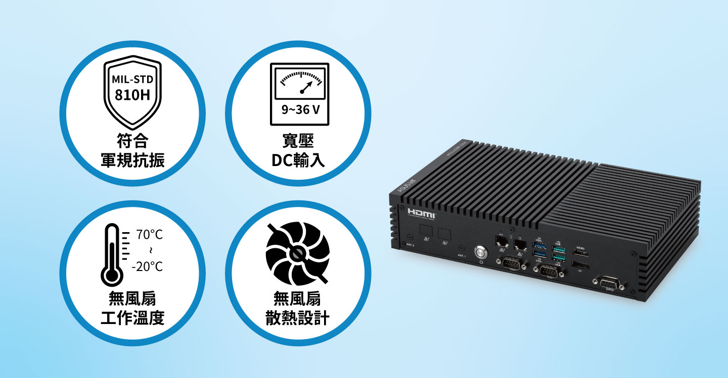 堅固的高效能無風扇邊緣電腦,卓越的散熱與電源設計,可在 -20°C 至 70°C 的環境以及 9 至 36V 寬廣的 DC 輸入電壓範圍內運作,機械設計符合 MIL-STD-810H 美國軍規測試標準,可承受各種衝擊和振動,適合智慧工廠、智慧運輸、資訊站...等嚴苛應用情境。