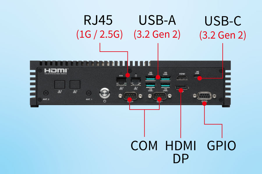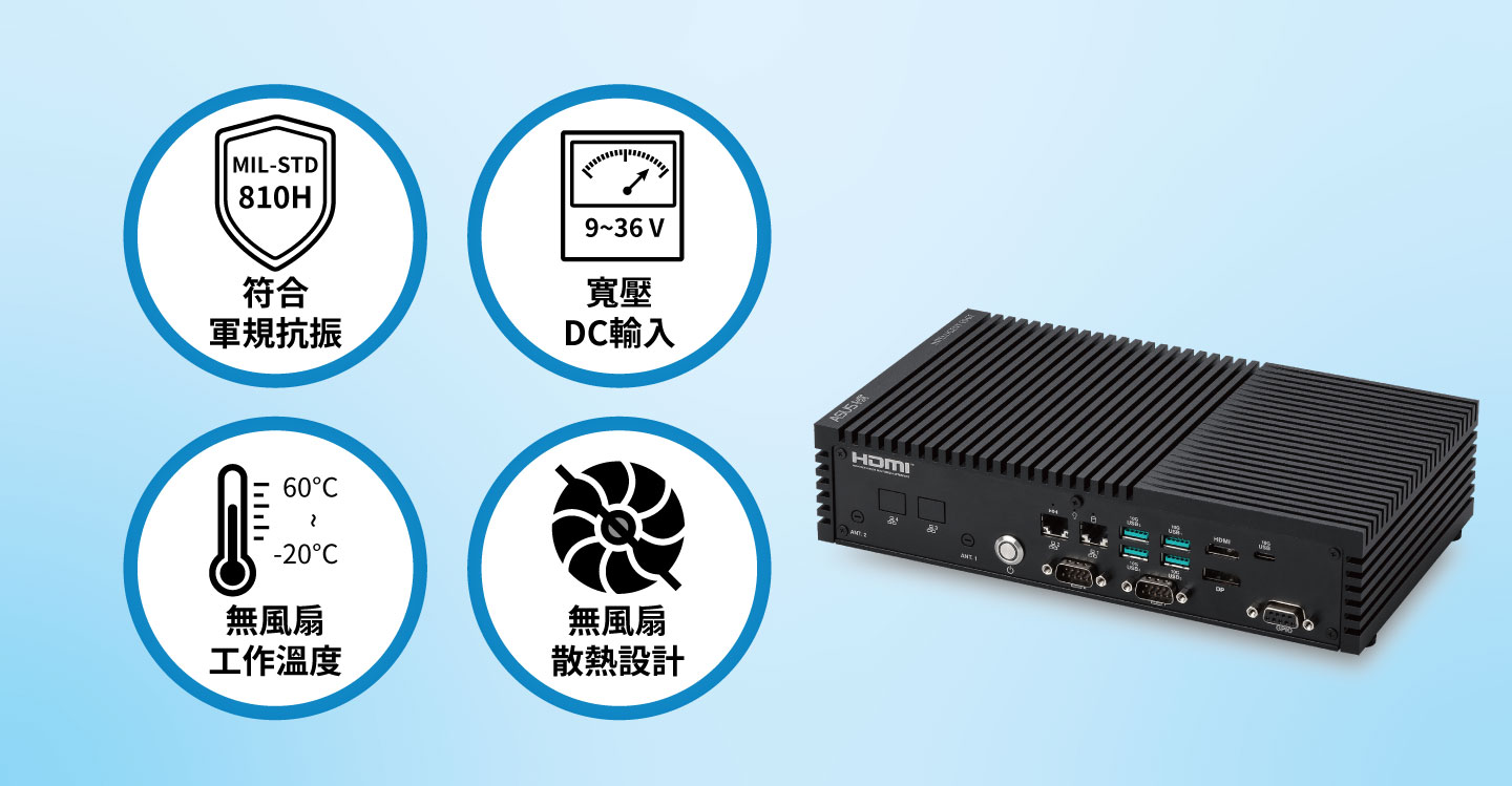 堅固的高效能無風扇邊緣電腦,卓越的散熱與電源設計,可在 -20°C 至 60°C 的環境以及 9 至 36V 寬廣的 DC 輸入電壓範圍內運作,機械設計符合 MIL-STD-810H 美國軍規測試標準,可承受各種衝擊和振動,適合智慧工廠、智慧運輸、資訊站...等嚴苛應用情境。