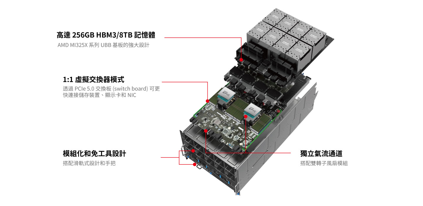 7U AMD Instinct™ MI325X 八 GPU 伺服器,配備雙 AMD EPYC™ 9005 處理器,擅長處理大型 AI 模型和 HPC 工作負載,具有多達 11 個 PCIe® 插槽、24 個 DIMM 插槽、10 個 NVMe 驅動器和雙 10Gb LAN。
