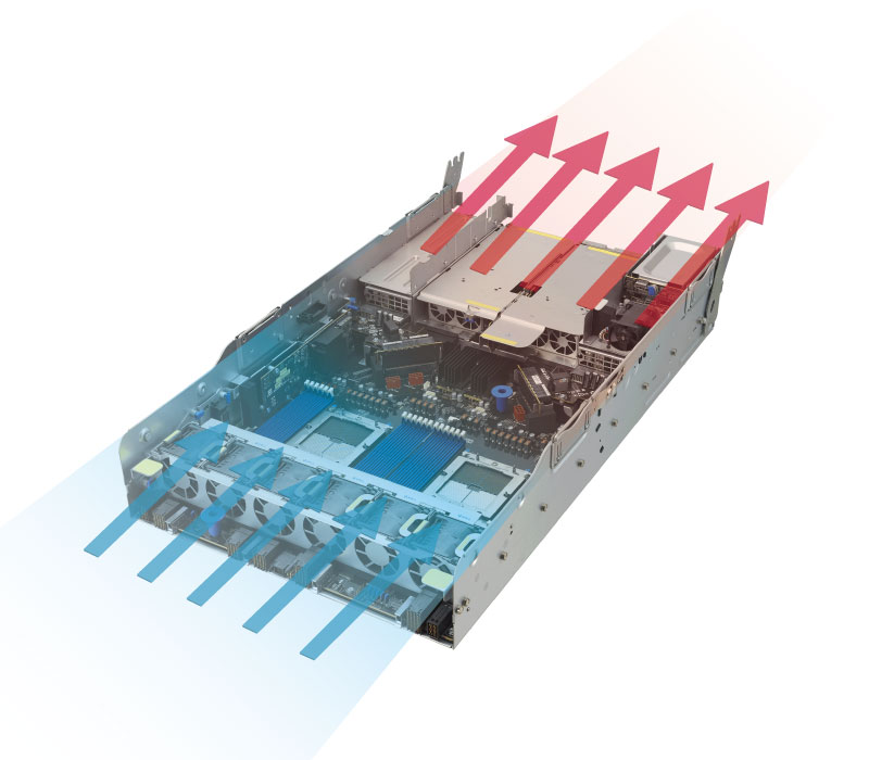 ESC A8A-E12U 在最緊湊的 7U 氣冷外形尺寸中提供高端 GPU 性能。 它結合了優化的散熱設計與獨立的 CPU 和 GPU 氣流通道,以確保卓越的散熱,並提高能源效率和節省電力。