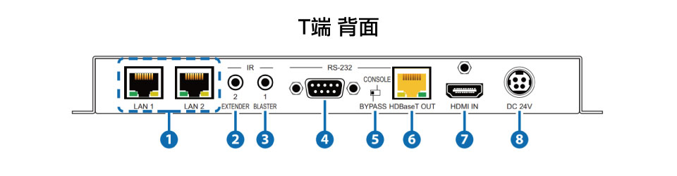 - RS-232: 連接PC&筆電或可在HDBaseT兩端控制RS-232設備信號