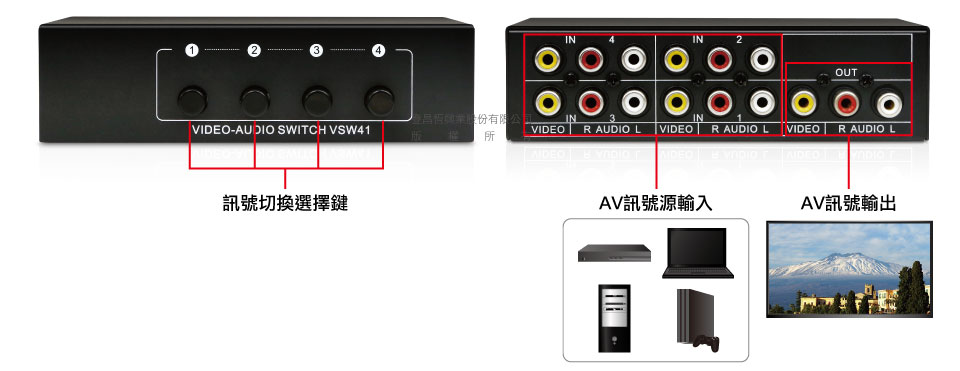 - 可將 4 組 AV 訊號來源,切換其中1組訊號輸出至AV電視機顯示。