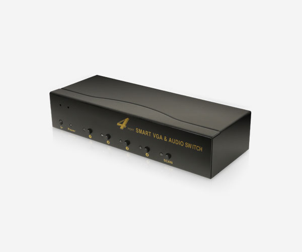 - 連接4組VGA畫面與3.5mm音訊,擇1組輸出至VGA螢幕上顯示及3.5mm喇叭播放。