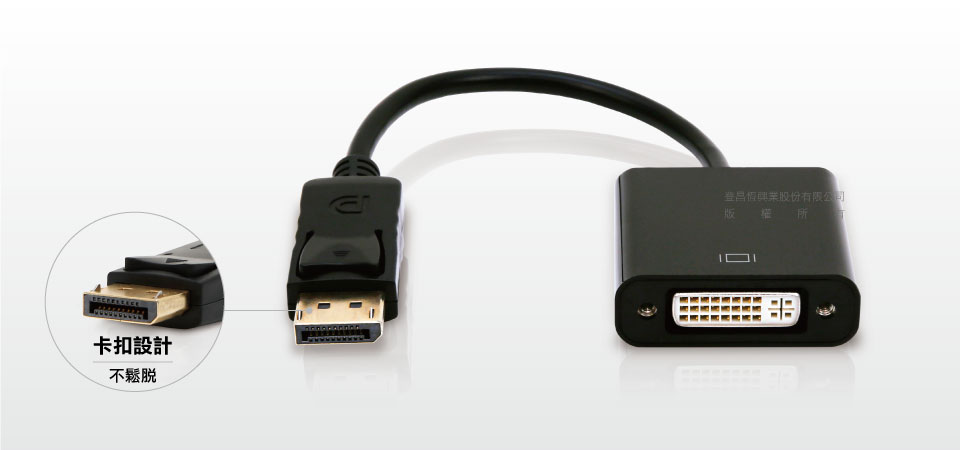 - 可將Displayport介面轉換為DVI介面,連接電腦螢幕、液晶電視或投影機。