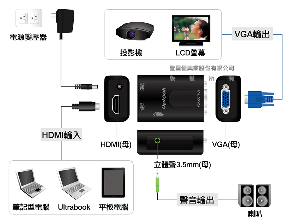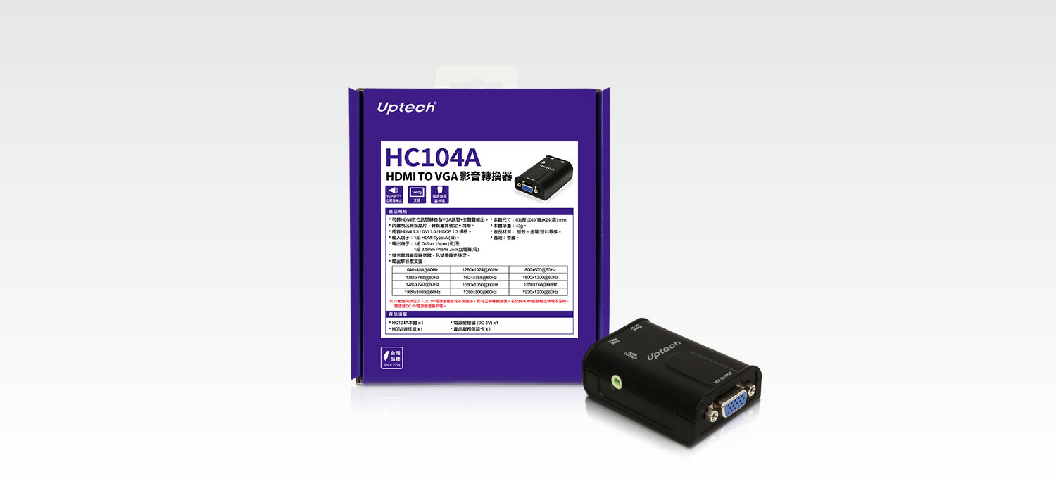 HC104A可連接筆記型電腦、Ultrabook、平板電腦,或其它具有HDMI輸出端子的設備,將HDMI數位訊號轉換為VGA端子+立體聲輸出,輕鬆的將影音畫面顯示在螢幕或投影機等顯示設備上面。