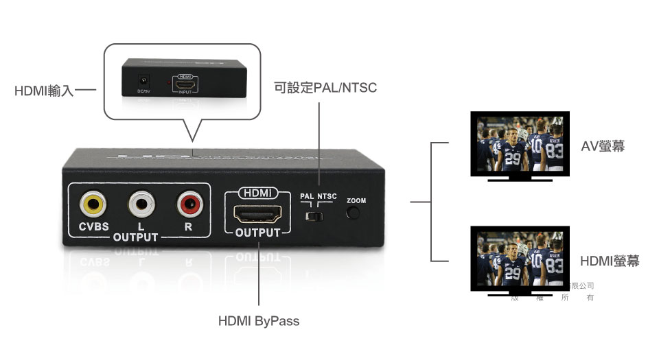 - 可將 HDMI 影音訊號轉換為 AV 影音訊號,並額 外提 供 1 埠 HDMI 影音訊號輸出。