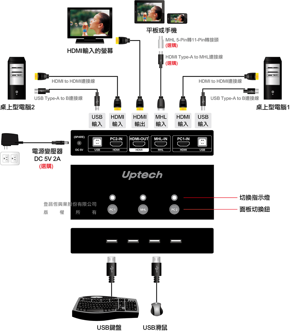 - 使用1組螢幕(HDMI介面)、鍵盤及滑鼠(USB介面),即可切換及控制2台電腦。