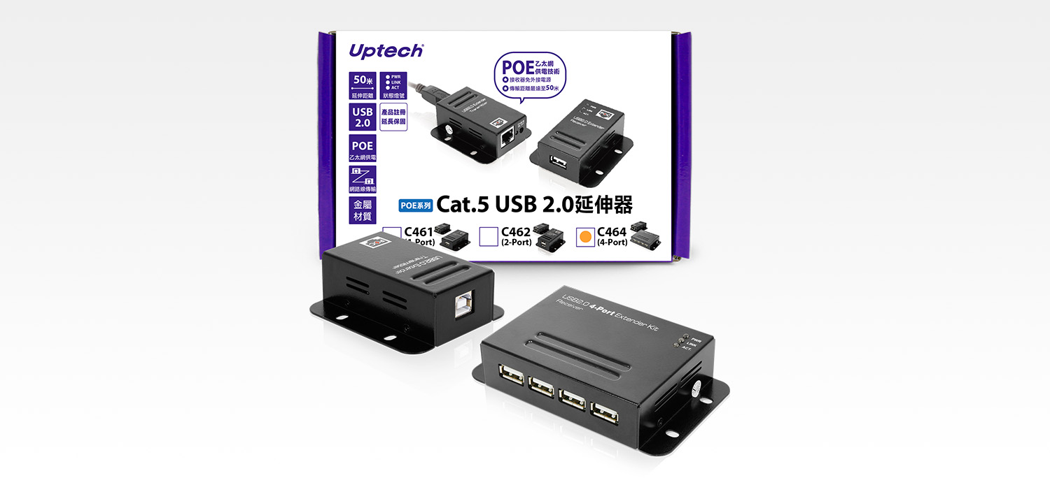 C464 Cat.5 USB 2.0延伸器可透過網路線連接並供應接收器電源,大幅減低配置電源線的時間與金錢成本。